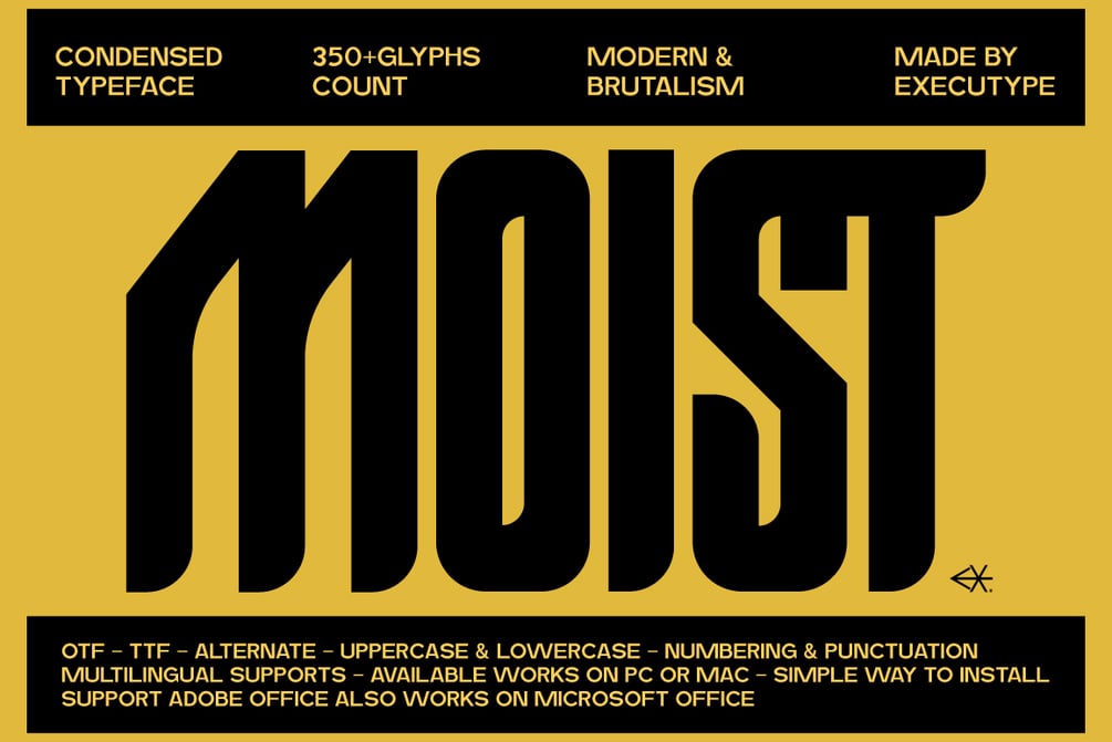 Moist Condesed Display the perfect bold and narrow font for headlines and captivating displays. Ideal for designers seeking a modern and impactful look with retro and vintage vibes. Transform your projects with this regular and slant, condensed typeface that demands attention.