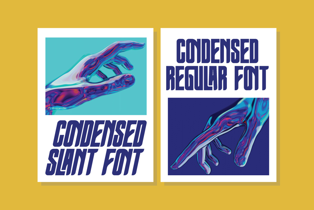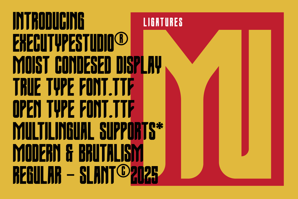 Moist Condesed Display the perfect bold and narrow font for headlines and captivating displays. Ideal for designers seeking a modern and impactful look with retro and vintage vibes. Transform your projects with this regular and slant, condensed typeface that demands attention.